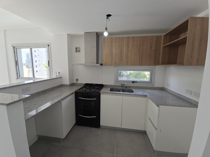 Cocina integrada con barra desayunadora, muebles bajo y sobre mesada, con extractor, artefacto de cocina, espacio para lavarropas, mesadas de granito y amplios lugares de guardado.