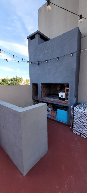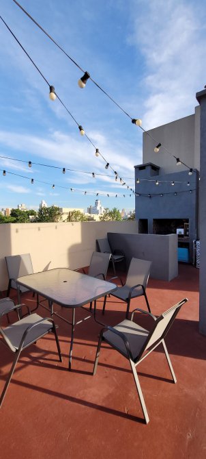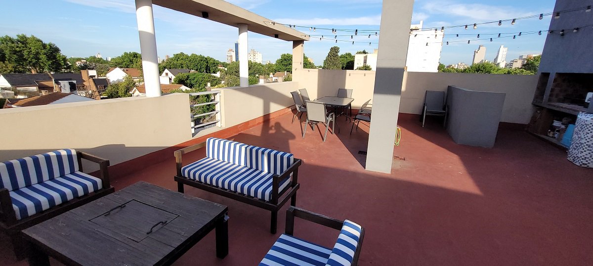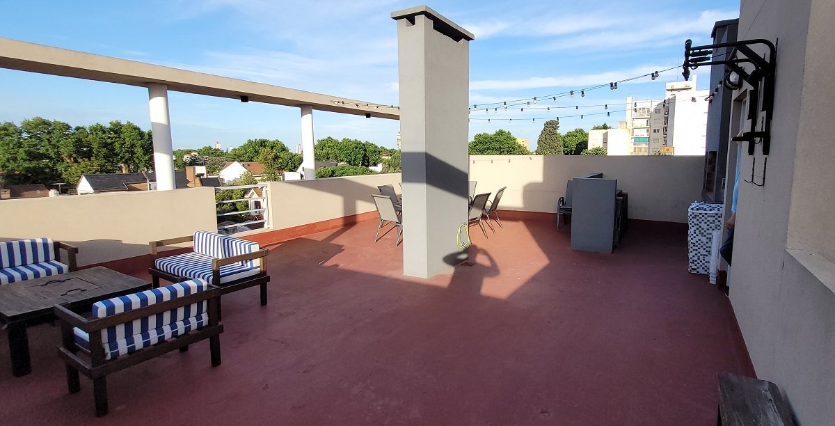 Excelente unidad de 3 ambientes, segundo piso en esquina, se compone de hall de ingreso, toilette de recepción, 2 dormitorios, uno para cama doble con placard, y el otro solo para cama simple o escritorio, baño completo y living comedor con cocina integrada con muebles bajo y sobre mesada y barra, el living con doble ventanal en esquina con salida a balcón corrido en L, en el piso 3 la unidad cuenta con una terraza propia de mas de 50m2 con parrilla y barra, con posibilidad de cerramientos, en planta baja se encuentra la cochera doble con espacio para dos autos medianos con portón automático.
