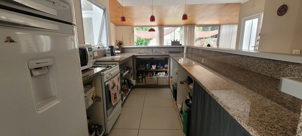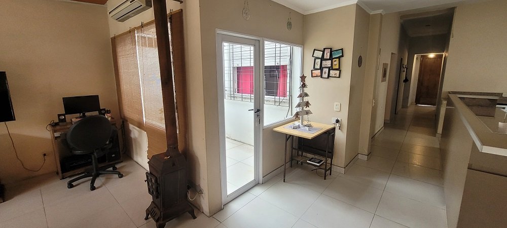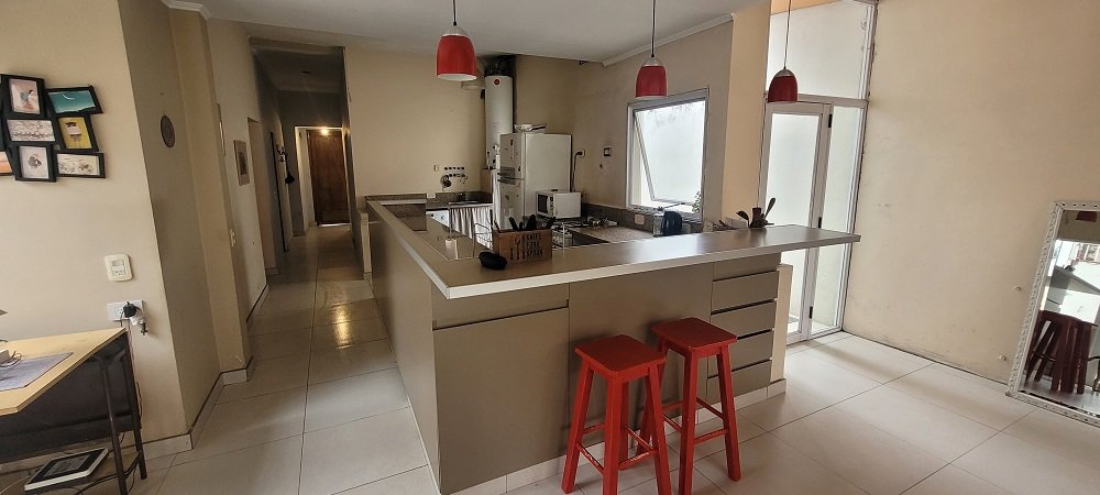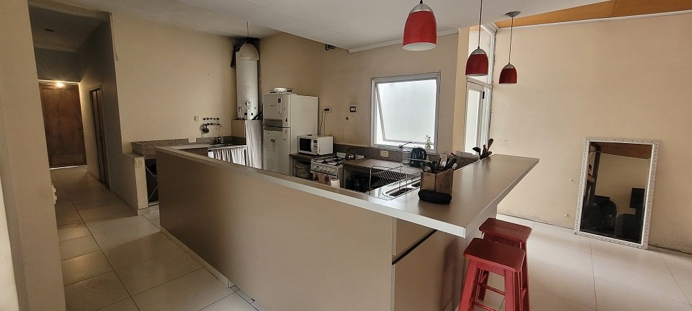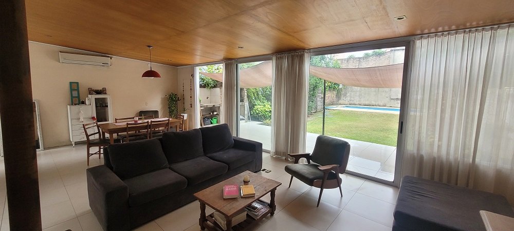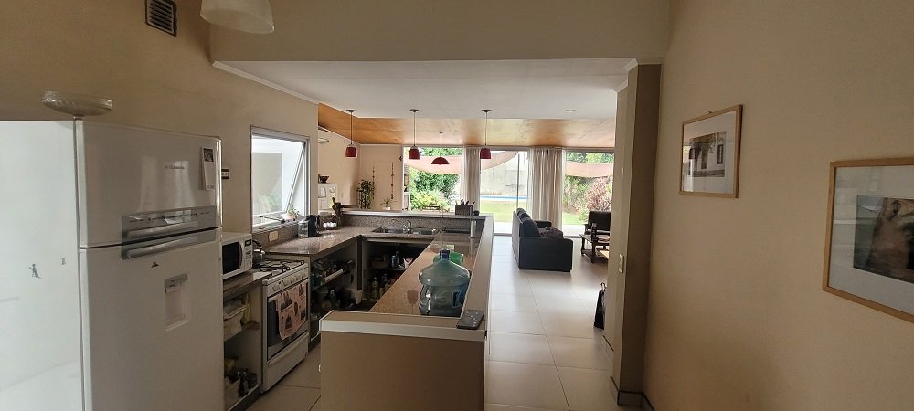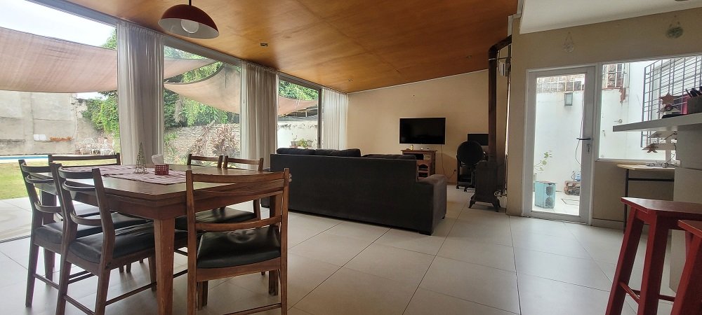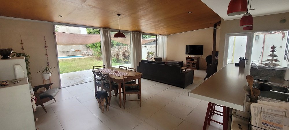 Ingreso a un hall y pasillo distribuidor que conecta con los 3 dormitorios todos con placard y el principal al frente en suitte con baño compartimentado, luego otro baño completo y compartimentado, amplia cocina integrada con barra y sectorizado el lugar para lavarropas, y salida a pasillo lateral descubierto que comunica con el garaje, por último un gran living comedor con amplios ventanales al parque y techos de madera, de todo el ancho del lote un lugar ideal para eventos o reuniones familiares.