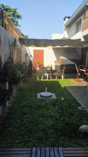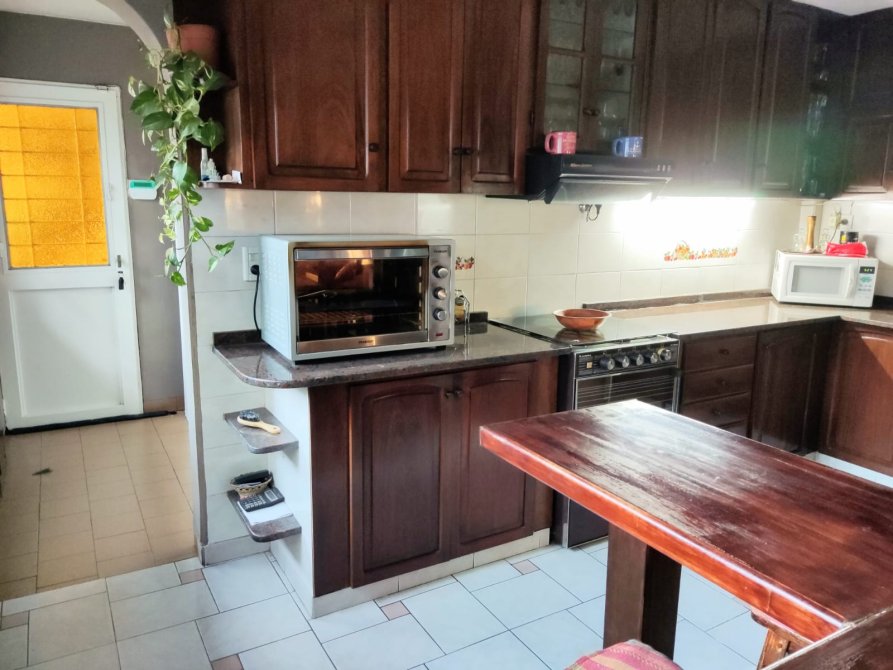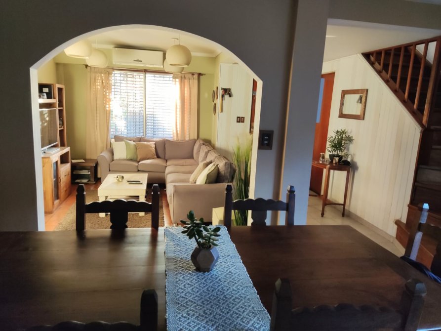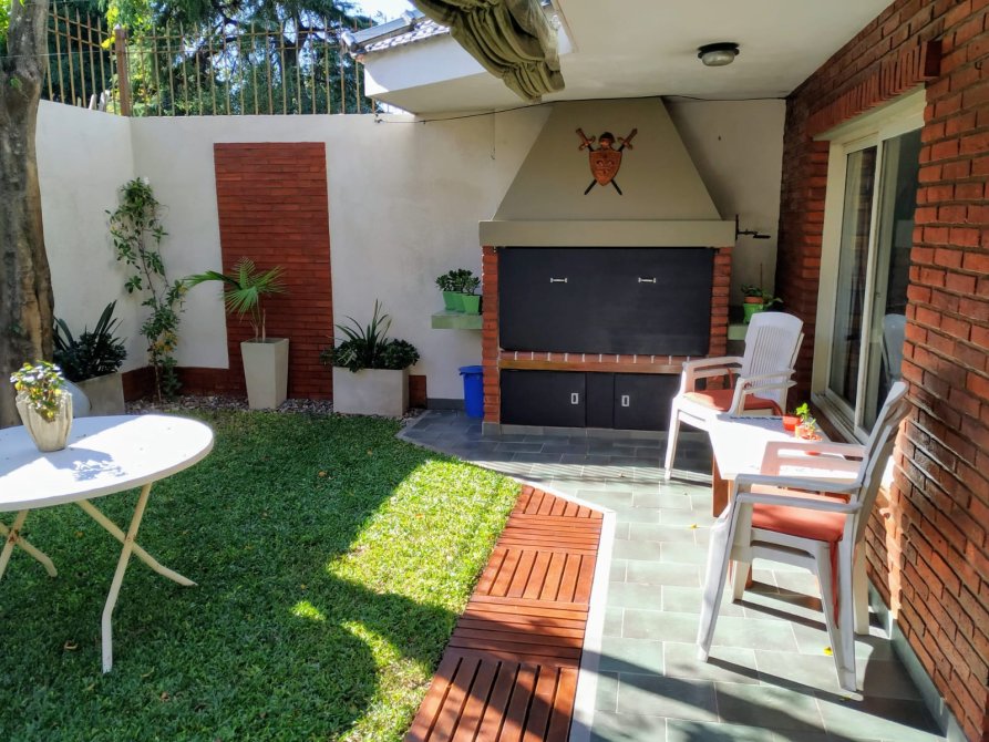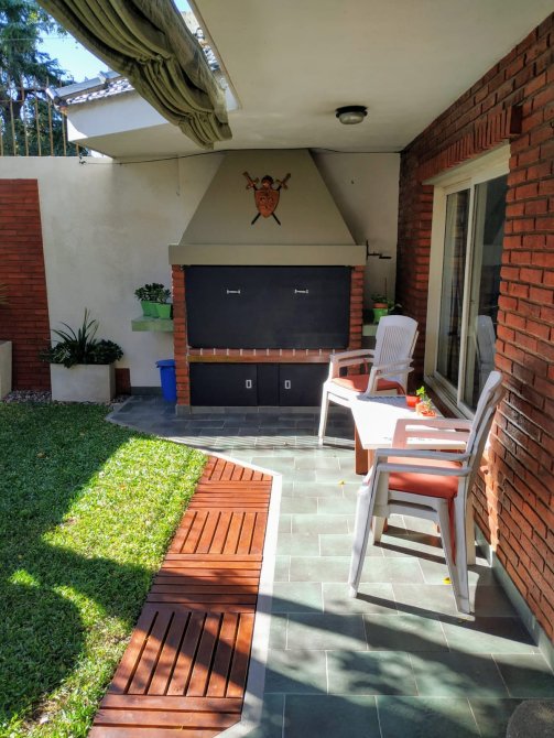 Hermosa casa tipo chalet de dos plantas con techos de tejas, se compone de frente de rejas, jardín, ingreso a living comedor con ventanales, toilette de recepción, amplia cocina con barra, con muebles bajo y sobre mesada en madera maciza, lavadero y cuarto de planchado con baño de servicio, garaje pasante para vehículos de gran tamaño, patio y parque con parrilla, quincho con una segunda cocina totalmente instalada, amplia boardilla con despensa.